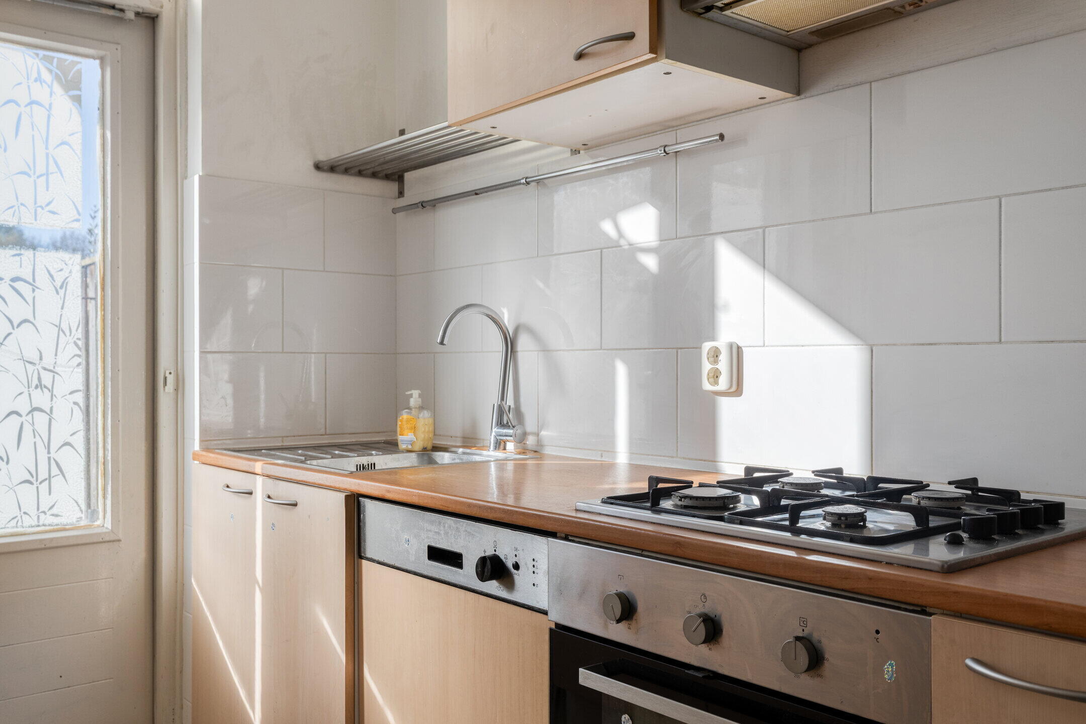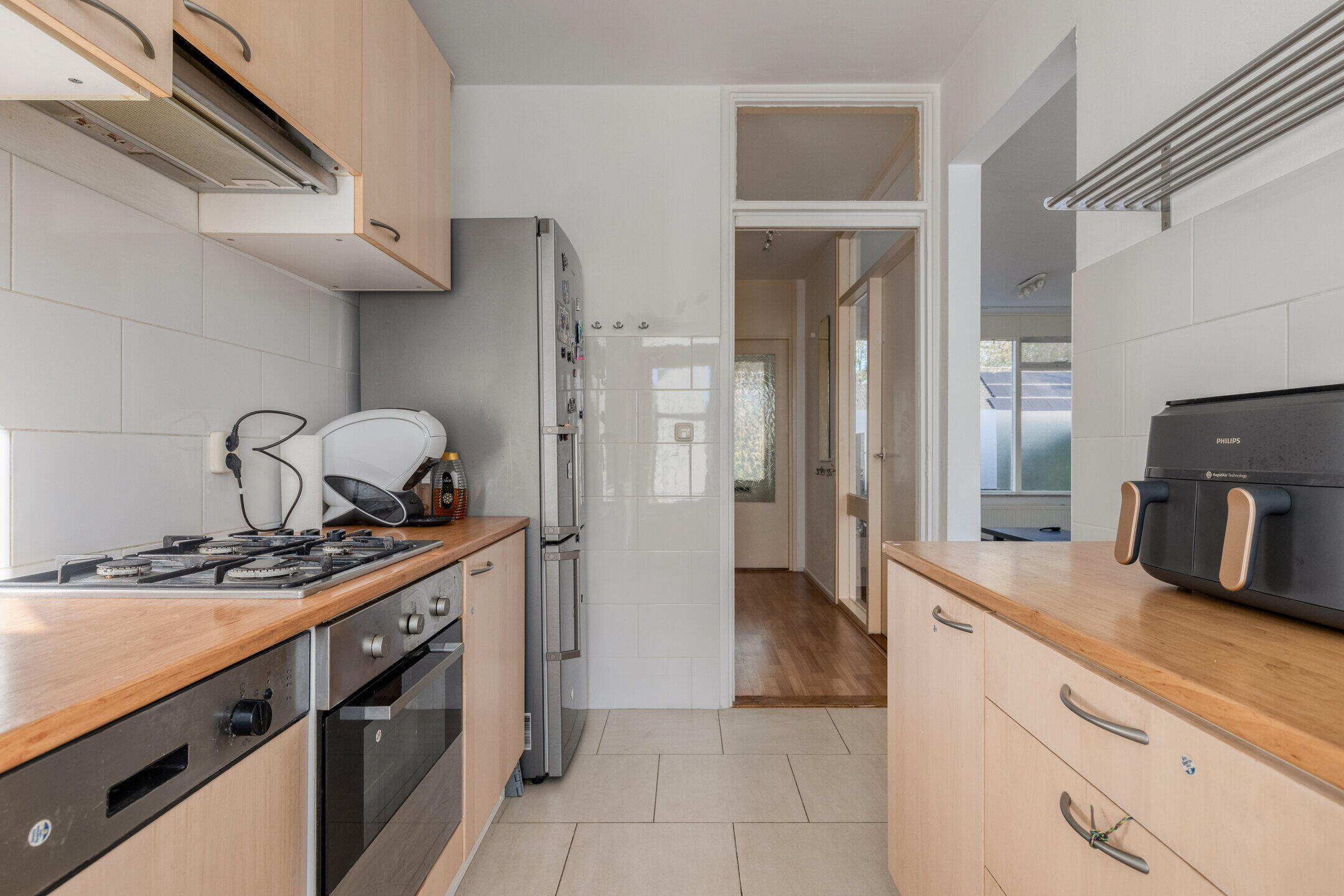 Er is een dichte keuken die zowel vanuit de hal alsook vanuit de woonkamer bereikbaar is. De keuken is voorzien van een eenvoudige dubbele inrichting met veel kastruimte en enkele ingebouwde apparaten waaronder een gaskookplaat, oven en vaatwasser.