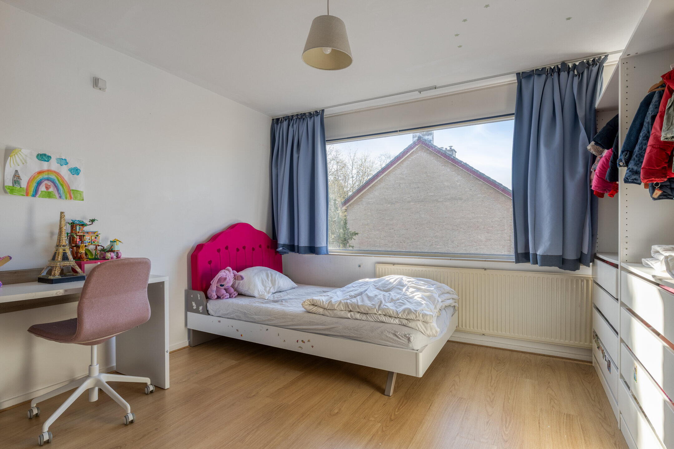 Eerste verdieping: overloop van waaruit alle vertrekken bereikbaar zijn; er zijn drie slaapkamers van respectievelijk 8, 14 en 17 m². De functionele badkamer is voorzien van een ligbad, wastafelmeubel en tweede toilet.